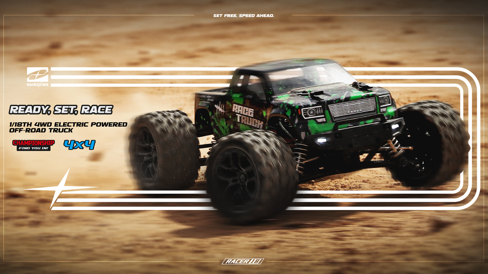 HAIBOXING 18859. 1/18 scale brushed RTR truck with upgraded electronics for enhanced response.