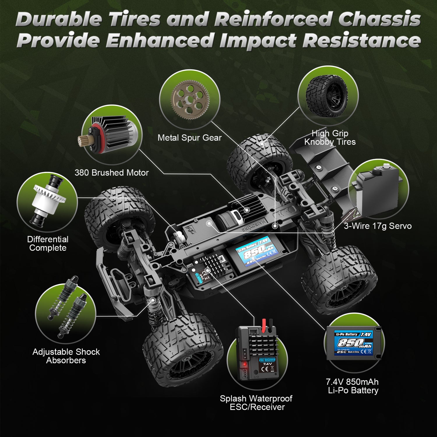 - Equipped with front and rear differentials and metal drive shafts, the car uses strong PA materials and a reinforced design for better impact resistance. Durable tires and a collision-resistant structure make it ideal for beginners.