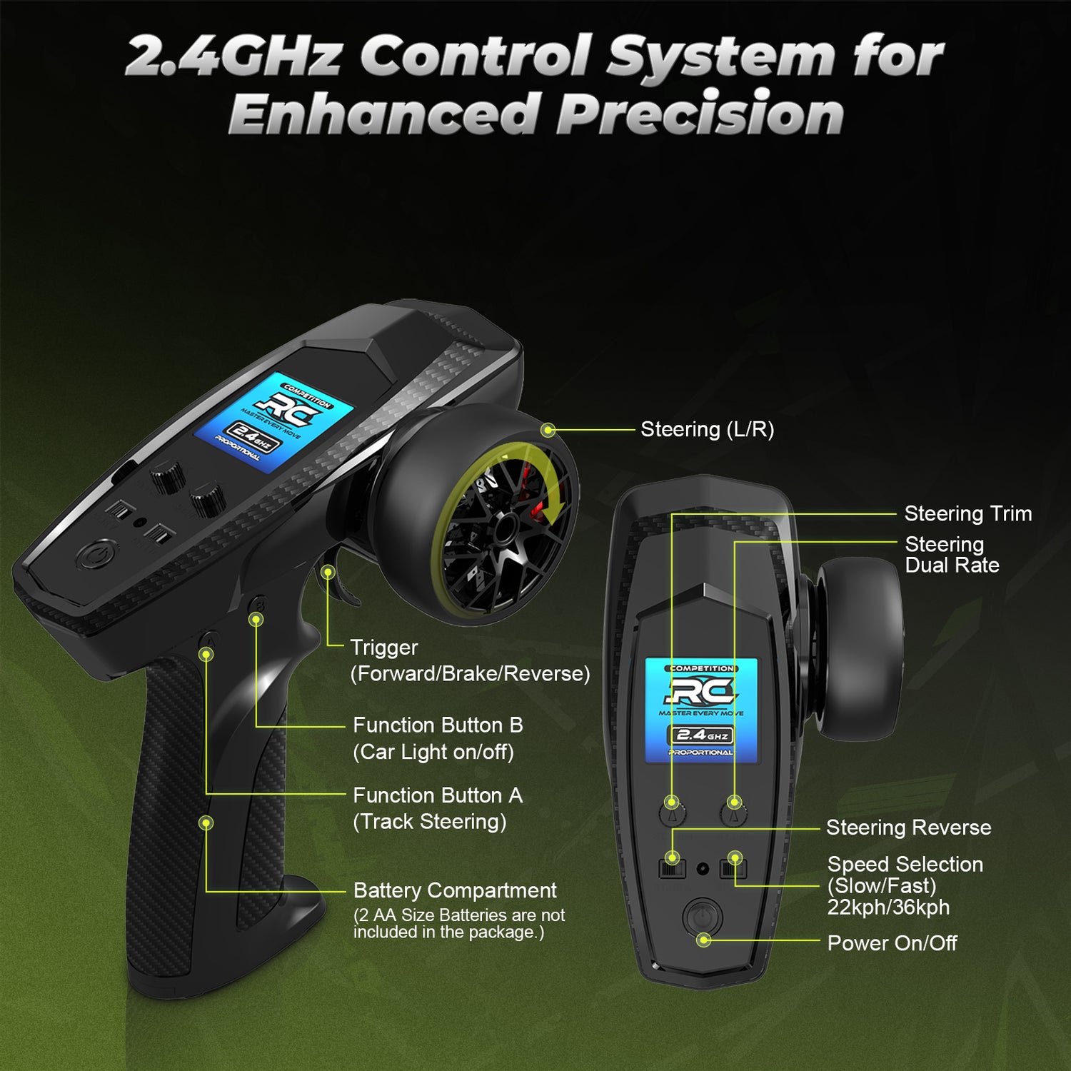 - The upgraded RC circuit system includes a 2.4GHz remote control with added features like overheat protection, anti-jam cut-off, and splash-proof waterproofing. With a control range of over 280 feet and upgraded electronic components, it's built for durability. (Note: New and old controllers are not compatible.)